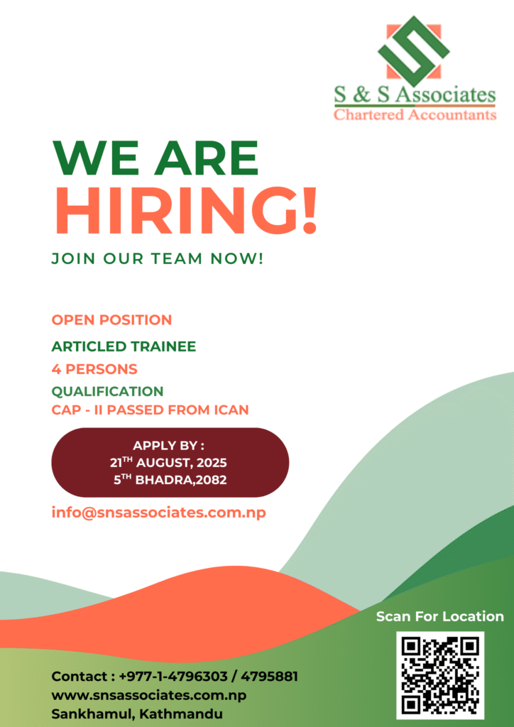 Blog details HomeUncategorizedVacancy for Articled Assistant August 2082 Vacancy for Articled Assistant August 2082 Uncategorized Sandesh Pokharel August 15, 2025 Recent Posts Social Security Regulation, 2075 December 3, 2018 Social Security Act, 2074 December 3, 2018 Nepal Government launched Social Security Schemes to all the Categories of People November 28, 2018 Procedure for Online Payment of Tax issued by IRD October 2, 2018 Procedure for Online Payment of Tax issued by IRD September 22, 2018 Nepal Law Commission September 20, 2018 Beema Samiti, Insurance Regulatory Authority of Nepal September 20, 2018 Securities Board of Nepal September 20, 2018